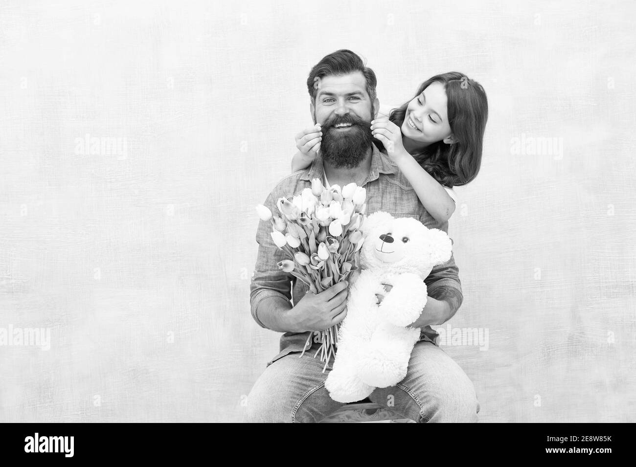 Moustache Are Classy Happy Daughter Twirl Fathers Mustache Little Child And Bearded Man Hold Flowers And Toy Barbershop Care Barber Shop Hair Salon Family Barbershop Copy Space Stock Photo Alamy
